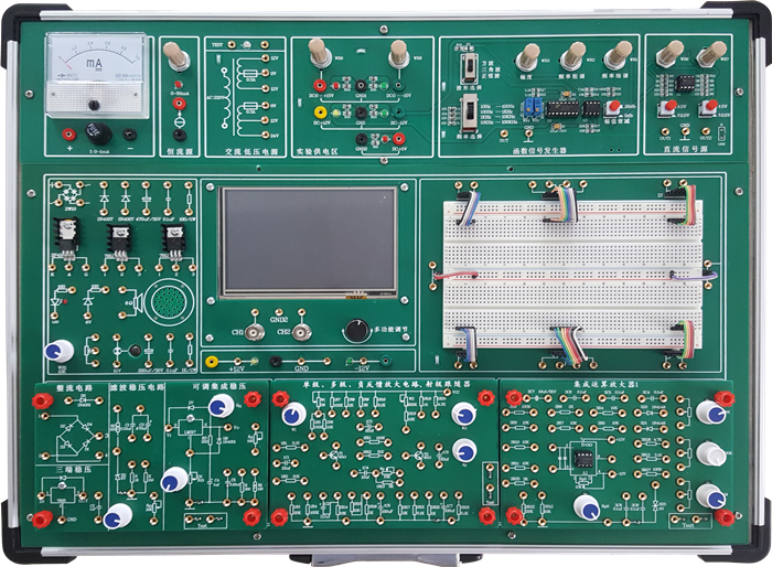 數(shù)電模電實(shí)驗(yàn)箱,數(shù)電實(shí)驗(yàn)箱、電路分析實(shí)驗(yàn)箱、數(shù)電模電高頻電路實(shí)驗(yàn)箱,主板配置有數(shù)電、模電實(shí)驗(yàn)時(shí)經(jīng)常用到的電源、信號(hào)源、輸入接口,輸出顯示接口、測(cè)量單元、實(shí)驗(yàn)擴(kuò)展區(qū),及實(shí)驗(yàn)?zāi)K電路,以完成不同的實(shí)驗(yàn),也可以進(jìn)行課程設(shè)計(jì)實(shí)驗(yàn),大大增強(qiáng)了該實(shí)驗(yàn)箱的適用性、擴(kuò)展性。實(shí)驗(yàn)原理圖都印刷在實(shí)驗(yàn)板表面,實(shí)驗(yàn)電路由學(xué)生按照實(shí)驗(yàn)原理圖進(jìn)行搭建,是培養(yǎng)了學(xué)生的獨(dú)立思維能力及動(dòng)手能力。實(shí)驗(yàn)連線插孔采用鎖緊式鍍金插孔,通過(guò)焊接固定在實(shí)驗(yàn)板上,不松動(dòng),不氧化,壽命長(zhǎng),連接可靠,維修方便、簡(jiǎn)捷;實(shí)驗(yàn)箱由一體型鉛合金型材制成,箱體牢固可靠,不變形,重量輕,絕緣安全性能好,開(kāi)關(guān)箱蓋方便可靠,外型美觀,造型氣派。